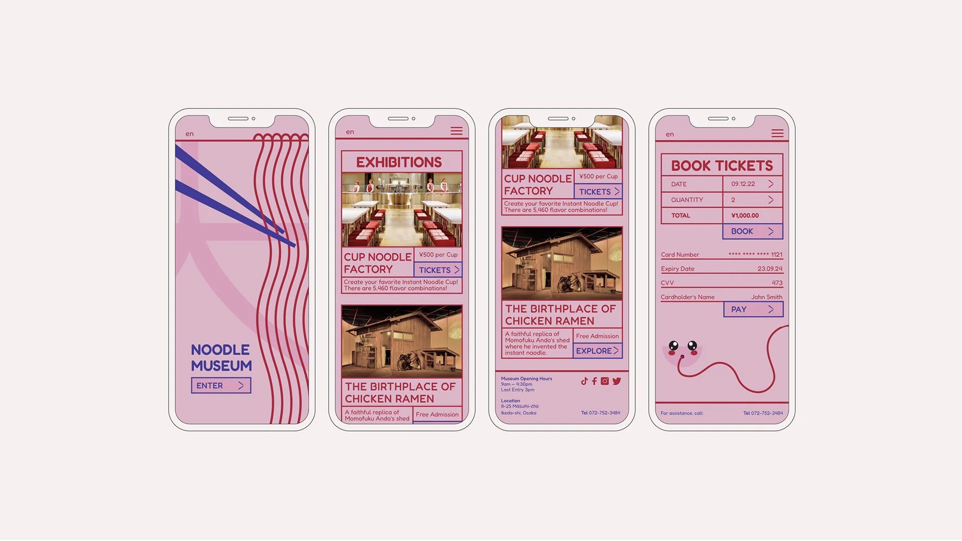 Taking inspiration from retro Japanese posters and menus, the new museum identity has a clean layout and limited colour palette, allowing for playful noodle graphics with elements of Kawaii design to take centre stage. A new logo mark combines a rounded typeface with noodle-esque letter forms, which are carried through the headings and graphic elements.