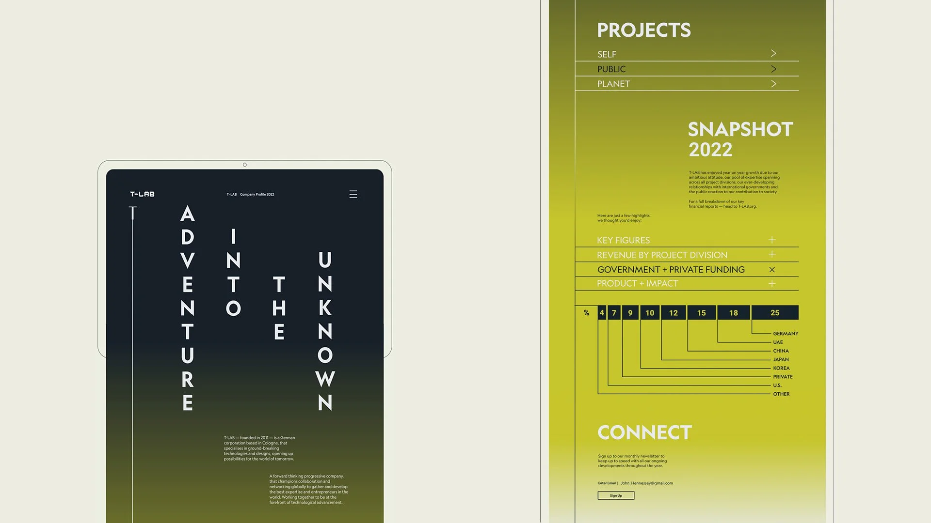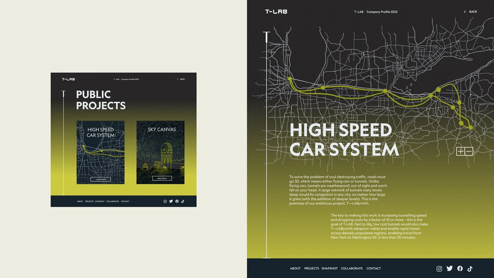 The digital layout for T-LAB starts with a dark and moody landing page that encourages the reader to scroll down to discover more. As they explore, the website transitions into a bold, adventurous colour. Paired back styling and negative space give the website a sophisticated and confident feel, essential for encouraging those investors with deep pockets.